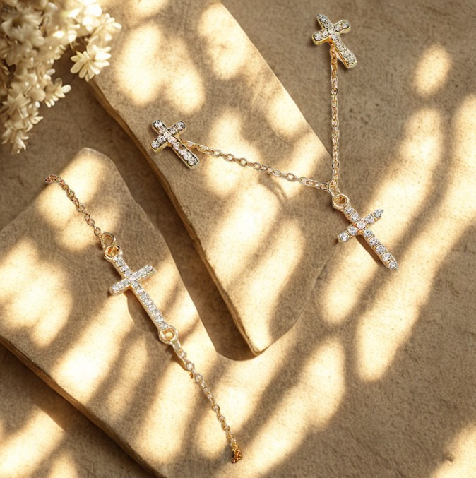 A beautifully coordinated 4-piece gold jewelry set featuring cross-inspired designs — a complete statement of faith, elegance, and devotion. Each piece in this set carries the power and promise of the cross, reminding you that God’s light and love shine through every part of your life. Wear them together to showcase your faith boldly, or individually as subtle daily reminders of God’s presence and grace.